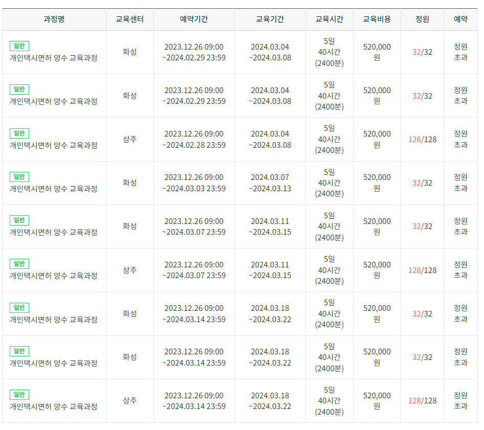 위 내용은 2024년 3월까지의 교육일정입니다. 모두 정원초과로 이미 마감이 된 상태입니다. 한달동안 700명 조금 넘는 인원이 교육을 받을 수 있습니다. 많은 숫자는 아닙니다. 게다가 교육을 받고 나서 3년안에만 개인택시 면허를 사면되어서 당장 개인택시를 하지 않는 분들도 많이 교육을 듣는다고 합니다. 그래서 더욱 교육 받기 어려운 현실이라고 합니다.