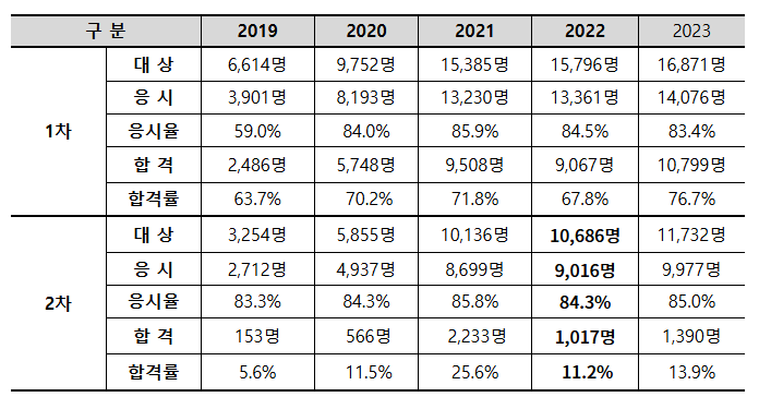 이는 합격률에서도 잘 드러납니다. 1차 시험 합격률은 70%대를 꾸준히 유지하고 있으며, 2023년에는 76%까지 상승했습니다. 꾸준히 노력하면 누구든 합격할 수 있는 수준이라고 볼 수 있습니다.