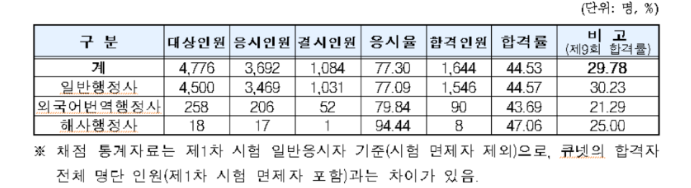 대략적으로 1차 시험 합격자와 면제자들이 모두 시험을 봐서 응시자는 1300명 정도 입니다. 그 중 합격자는 257명이었네요. 합격률은 20%를 밑돌고 있습니다. 위 표에서 전부면제는 앞서 말씀 드린 시험을 면제받는 사람들입니다.