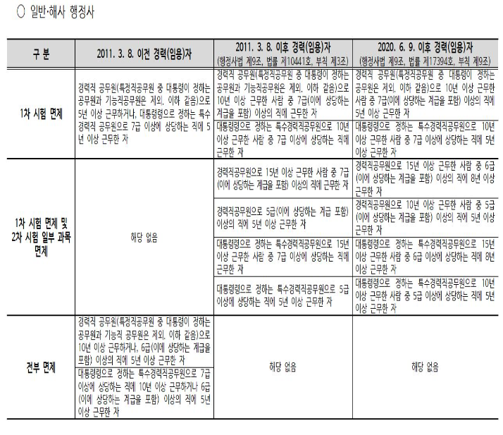면제 조건은 위와 같습니다. 2020년 이후 임용자는 더욱 까다롭게 변경이 되었습니다. 쉽게 말씀드리면 2011년 이전의 임용자의 경우 공무원 경력이 5년 이상이면 1차 시험 면제, 10년 이상이거나 6급 이상 5년의 경우 전부 면제 입니다.