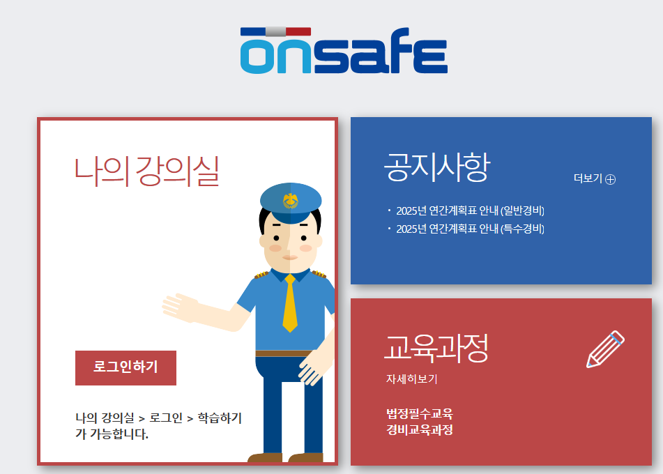 위 사이트는 하나의 예시이며, 실제로는 소속된 경비 업체에서 제공하는 온라인 교육 플랫폼을 이용해야 합니다. 따라서, 현재 경비원으로 근무하고 있지 않은 경우에는 해당 사이트에 회원 가입이나 로그인이 불가능합니다.